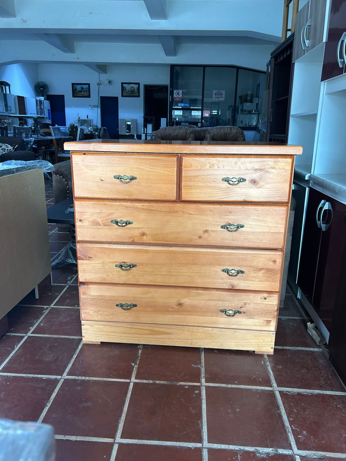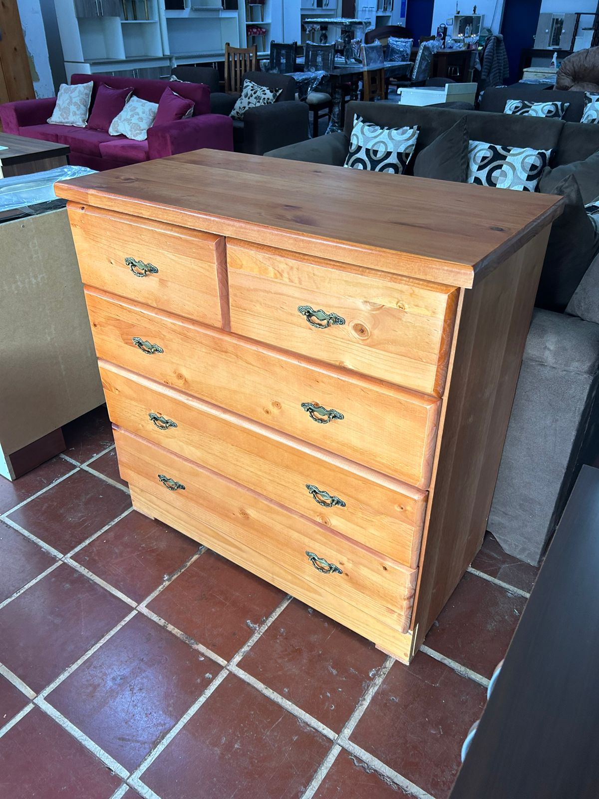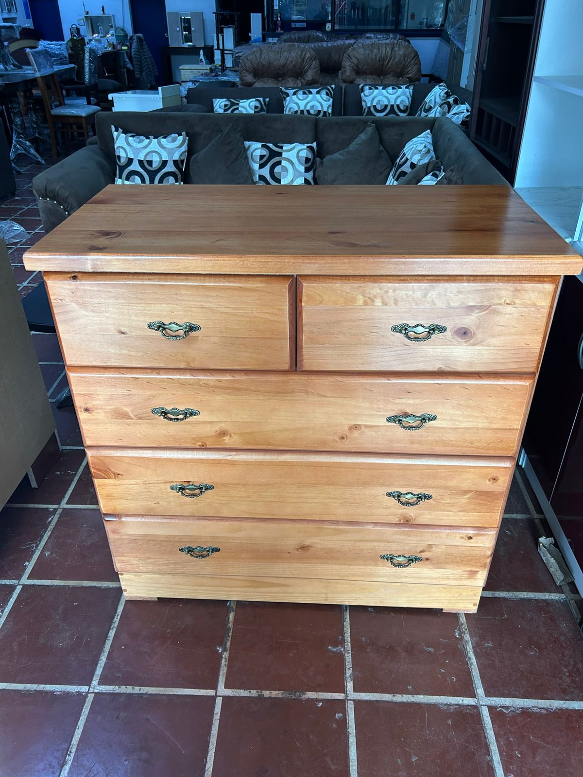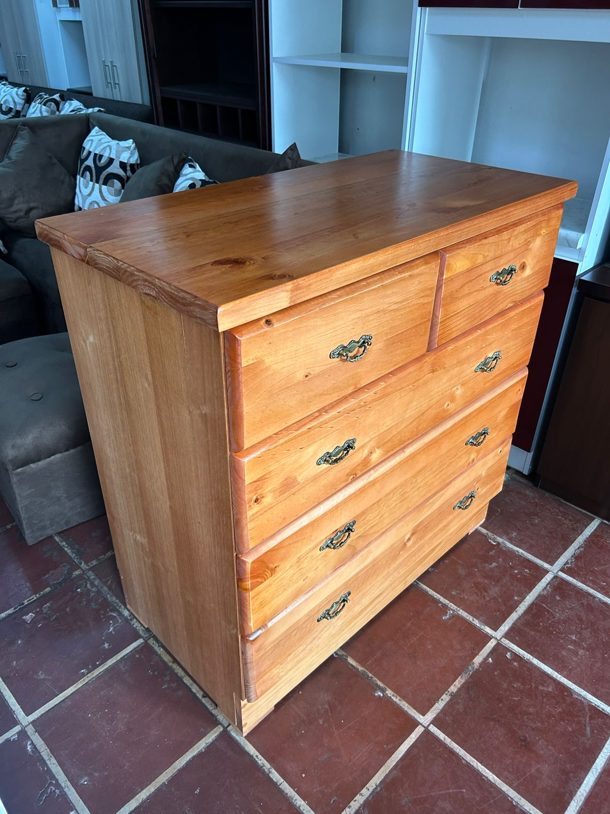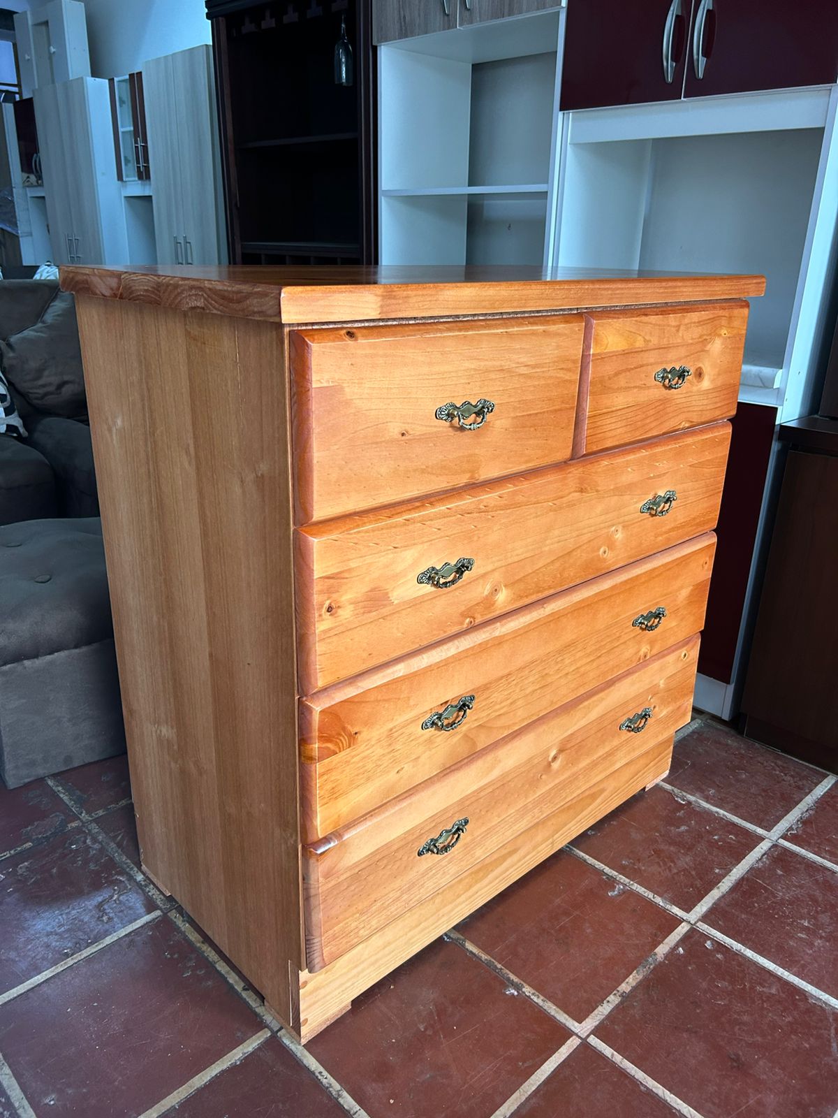 Elegante cómoda de madera maciza en tono natural barnizado, perfecta para dormitorios o espacios de almacenamiento. Su diseño clásico y resistente combina funcionalidad con estilo rústico.
