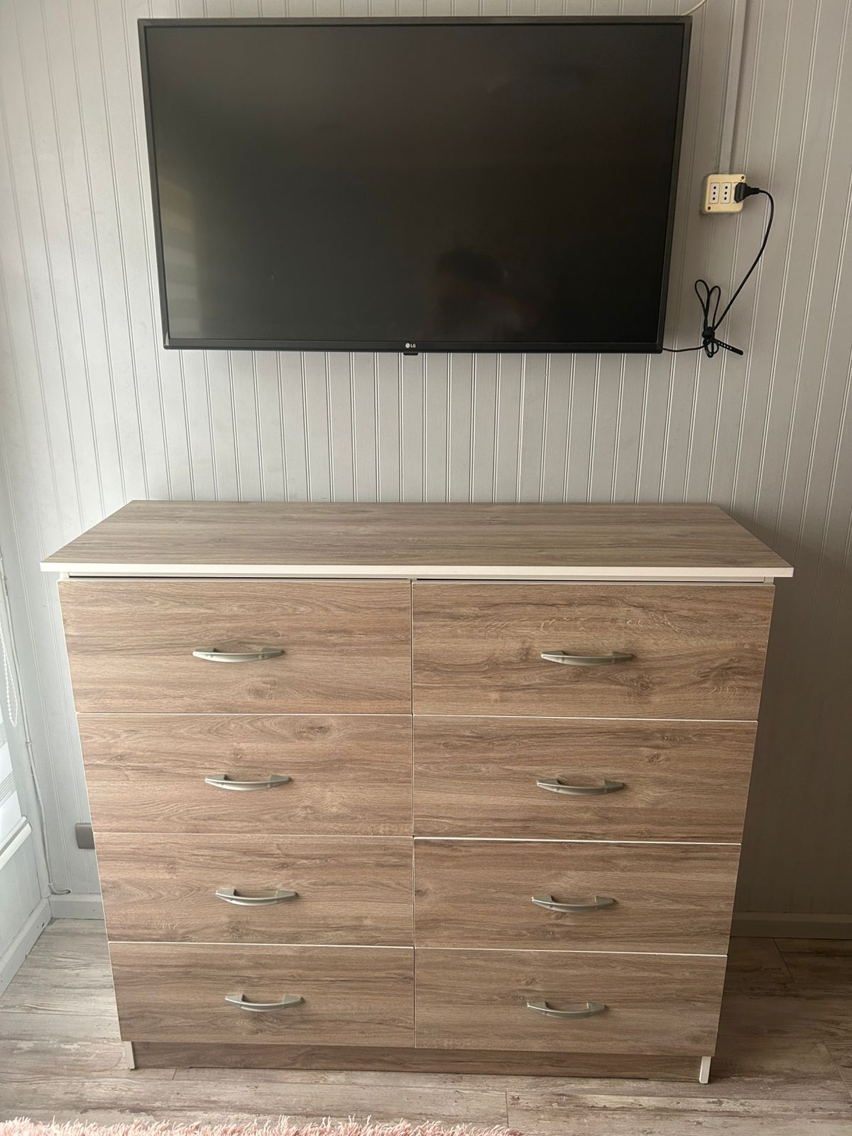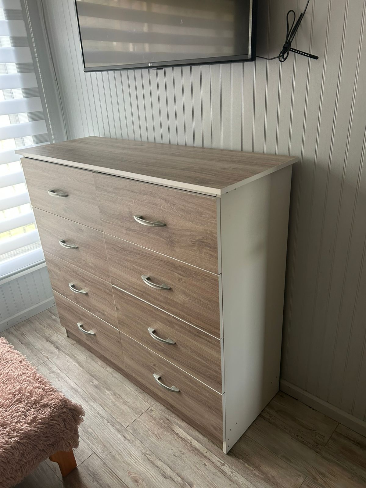 Con sus 1.20 m de largo, 90 cm de alto y 50 cm de fondo, ofrece gran capacidad de almacenamiento en sus múltiples cajones, ideales para mantener todo en su lugar. Su acabado en tonos naturales de madera aporta armonía y frescura, creando un ambiente acogedor y equilibrado.